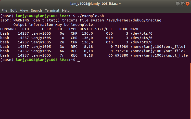 파일 디스크립터를 9개 까지만 쓸 수 있으므로 이들을 올바로 유지 관리하는 일은 별로 어렵지 않다고 생각할 수 있지만, 때때로 어떤 파일 디스크립터가 어디로 리다이렉트되어 있는지를 놓치기 쉽다. 상황을 제대로 유지시키는 데 도움이 되도록 배시 셸은 lsof 명령을 제공한다.
